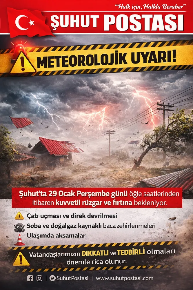 T.C. Afyonkarahisar Valiliği tarafından yapılan meteorolojik uyarıya göre, il genelinde etkili olması beklenen kuvvetli rüzgârın saatte 50–70 kilometre, yüksek kesimlerde ise 90 kilometreye kadar ulaşabileceği bildirildi.