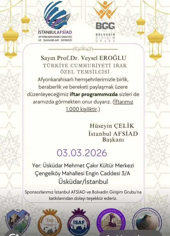 03 Mart Afyonkarahisarlılar Günü vesilesiyle düzenlenen iftar programının, İstanbul’daki hemşehriler arasında dayanışma ve hemşehrilik bağlarını daha da güçlendirdiği ifade edildi.