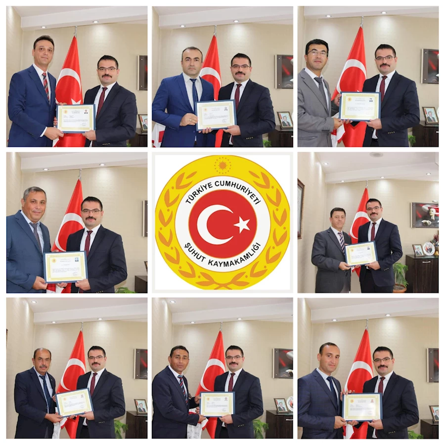 Şuhut Kaymakamı Harun Reşit Han tarafından Şuhut Kaymakamlığı İlçe Yazı İşleri Müdürü Sadullah BAŞTÜRK'e ve Kaymakamlık İlçe Yazı İşleri Müdürlüğü personeline hizmet sunumunda gösterdikleri üstün gayret ve başarılı çalışmalarından dolayı başarı belgesi verildi.