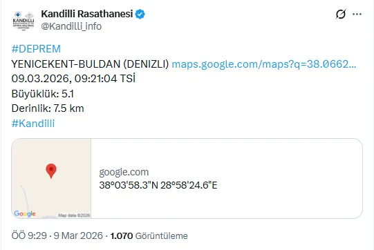 Denizli’nin Buldan ilçesine bağlı Yenicekent Mahallesi merkezli 5,1 büyüklüğünde deprem meydana geldi.