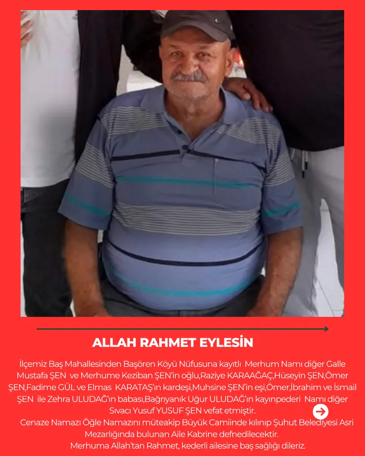İlçemiz Baş Mahallesinden Başören Köyü Nüfusuna kayıtlı Merhum Namı diğer Galle Mustafa ŞEN ve Merhume Keziban ŞEN’in oğlu,Raziye KARAAĞAÇ,Hüseyin ŞEN,Ömer ŞEN,Fadime GÜL ve Elmas KARATAŞ’ın kardeşi,Muhsine ŞEN’in eşi,Ömer,İbrahim ve İsmail ŞEN ile Zehra ULUDAĞ’ın babası,Bağrıyanık Uğur ULUDAĞ’ın kayınpederi Namı diğer Sıvacı Yusuf YUSUF ŞEN vefat etmiştir.