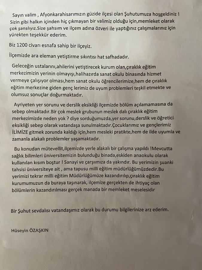 Afyonkarahisar’ın Şuhut ilçesinde, esnaf ve sanatkârların uzun süredir talep ettiği Çıraklık Eğitim Merkezi konusu gündeme taşındı. Şuhutlu esnaf Hüseyin Özaşkın, Sayın Valimizin düzenlediği halk toplantısına katılarak ilçede yaşanan önemli bir ihtiyacı dile getirdi.